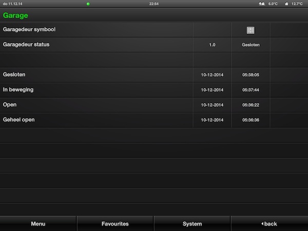 Op de Garage pagina worden alleen de laatste tijden van opening, sluiting ed. van de deur weergegeven.