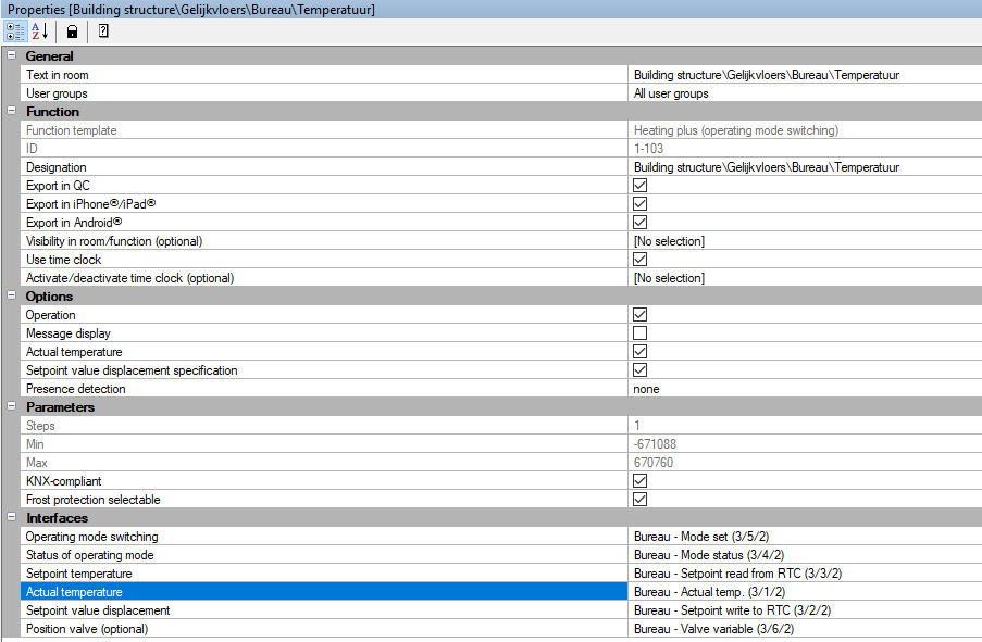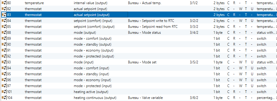 In ETS zie ik de volgende objecten: Als ik dan in de parameters de "thermostat logic" aanzet, zie ik de volgende objecten: Deze moeten toch te koppelen zijn aan een bestaande template in de Expert software? Alleen is het niet helemaal duidelijk wat je nu wil bereiken, je hebt een gewone schakelaar met knoppen, geen echte RTC zoals de Basalte Deseo?