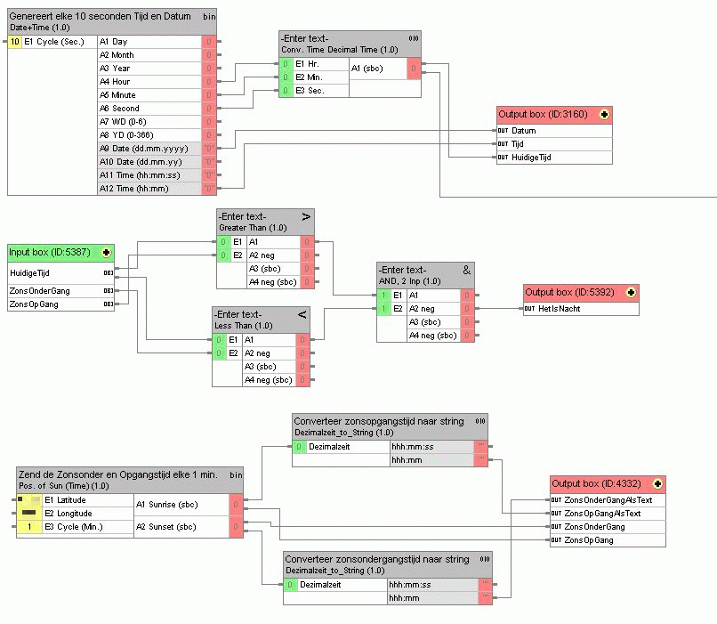 Ik heb de tijden ondertussen omgezet naar minuten, en zo vergeleken. Dat werkte. Ik zal die versie vanavond misschien eens aan de post hangen. Alleen is het een beetje omslachtig. Blijkbaar ligt het probleem bij de bouwsteen die de zonsopgang en ondergangs tijd genereert. Als ik die omzet met de bouwsteen die decimaal tijd naar text converteert lukt dat goed en geeft dat een goed geformatteerde tijd, dus ik dacht dat daar decimaal tijd uitkomt. Maar als ik dan de waarde uit die zontijdgenererende bouwsteen als decimaal tijd gebruik om te vergelijken dan bleek die waarde plotseling 0 te zijn, terwijl dezelfde bewerking bij de bouwsteen die de huidige tijd genereerde wel een waarde genereerde verschillend van 0. Heel gek. Zou wel willen verder zoeken waarom ie dat deed, maar debuggen is zo'n pain in the ass dat ik nu ik iets heb dat wel werkt het maar zo zal laten.